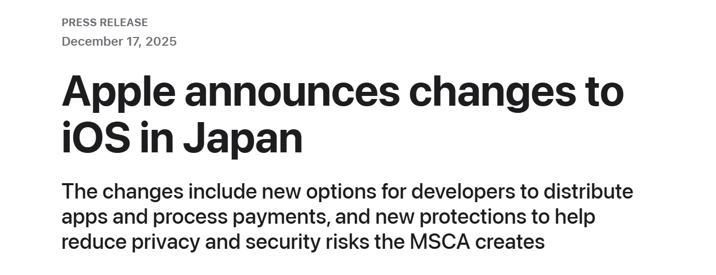 当地时间12月18日,日本政府去年出台的《智能手机软件竞争促进法》正式生效,该法案直接将矛头指向苹果等国际科技巨头,点名要求其改正应用市场的垄断现象。在法案正式生效的前一天,苹果公司已在官网发布新闻稿,宣布将更新在日本地区的应用商店条款,在开放第三方应用市场的同时也将“苹果税”的抽佣比率降低至10%至21%。 所谓“苹果税”,是指当苹果用户通过苹果手机应用商店,付费下载应用或在应用内部购买数字商品或服务时,需先打款给苹果支付系统,苹果抽成10%-30%后,再将剩下的款项转给开发者。多年以来,其高昂的抽成比率已让来自全球的应用开发商乃至个人消费者怨声载道,可谓“天下苦苹果税久矣” 。 2024年6月,日本国会正式通过《智能手机软件竞争促进法》,授权日本公平贸易委员会对具有垄断地位的软件提供商施加一系列禁止行为与合规义务,旨在让消费者能够自主选择更低廉、便捷的服务,并提升使用体验。而该法案已指定苹果和谷歌两家国际巨头作为管制对象,禁止其采取排他性措施,例如阻碍使用第三方的支付手段,或限制外部应用企业使用语音识别等OS功能。 在合规压力之下,苹果公司于12月17日正式宣布对日本市场的iOS系统进行调整,做出了一定让步。