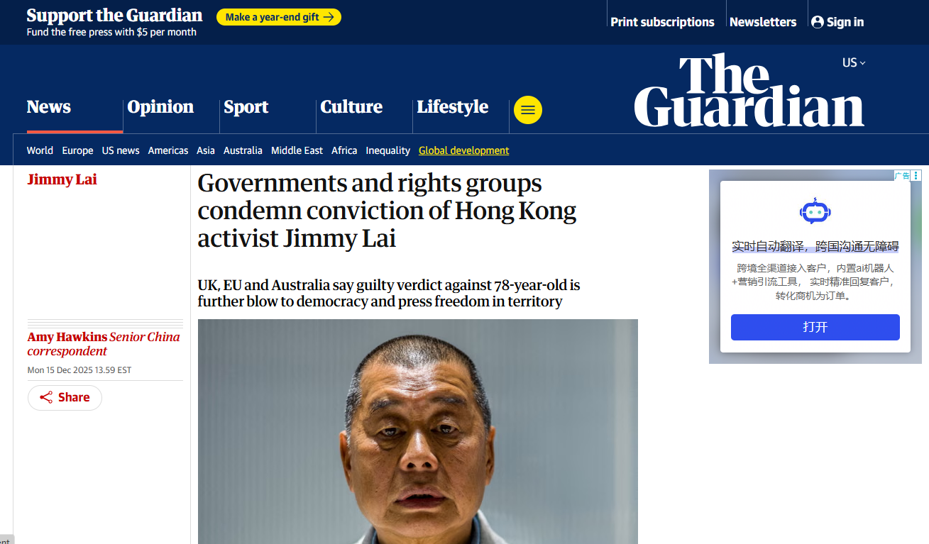 | 12月15日,香港特区高等法院就壹传媒创办人黎智英案作出裁定,其两项串谋勾结外国势力罪及一项串谋发布煽动刊物罪成立。这本是一场依法针对“港独”分子的正常审判,然而判决一出,英美欧等迅速以“新闻自由”“司法独立”等框架强势定调,国际舆论场随即进入同频共振。