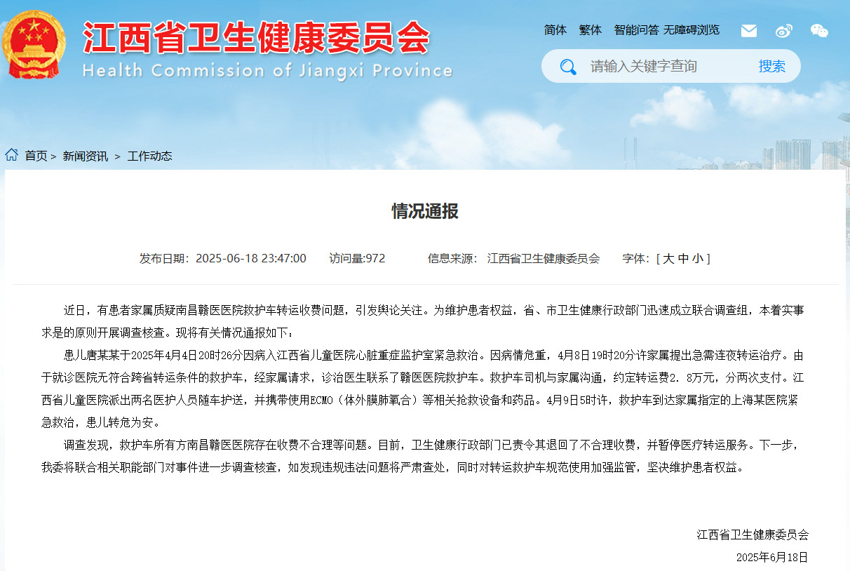 系统公示的违法事实显示,该医院员工以该医院名义私自转运江西省儿童医院患者唐某某至上海市内医院急诊,全程往返路程为1600公里,转运业务收取该患者转运费2.8万元,因该医院未对案涉救护车及员工进行有效管理,致使该医院工作人员驾驶救护车转运服务中,在“救护车费”公示标价外加收价款1.7万余元。此外,该医院存在使用超过有效期的药物、在医疗服务过程中有超标准收费、重复收费的行为。 今年6月,“乘救护车从江西省儿童医院转运至上海某医院,被收2.8万元”一事曾引发热议。一患儿家长表示,今年4月,其身患重症的孩子连夜从江西转运至上海某医院,800公里路程被“民营救护车”司机收费28000元,没有价格明细和发票,连费用都是转入个人账户。 事件被爆出后,引起大量网民关注。有网民质疑救护车收费不规范,并质疑2.8万元的高额收费是否有“趁人之危”的嫌疑。但也有网民认为对医院来说这一收费属于正常水准,没有暴利空间,且救护车接受远程转运重症病人本身也承担了大量风险。 针对此事,江西省卫健委曾发布通报表示,经调查发现,救护车所有方南昌赣医医院存在收费不合理等问题。目前,卫生健康行政部门已责令其退回了不合理收费,并暂停医疗转运服务。