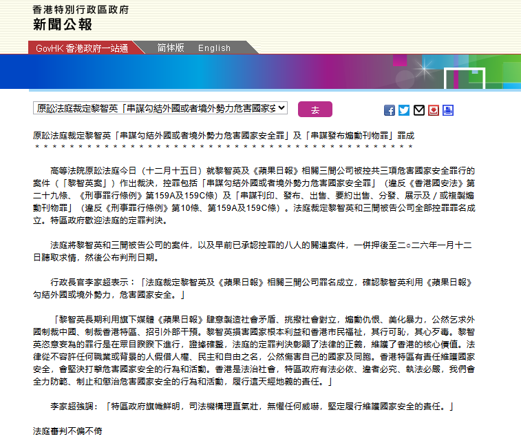 | 12月15日,香港特区高等法院就壹传媒创办人黎智英案作出裁定,其两项串谋勾结外国势力罪及一项串谋发布煽动刊物罪成立。这本是一场依法针对“港独”分子的正常审判,然而判决一出,英美欧等迅速以“新闻自由”“司法独立”等框架强势定调,国际舆论场随即进入同频共振。