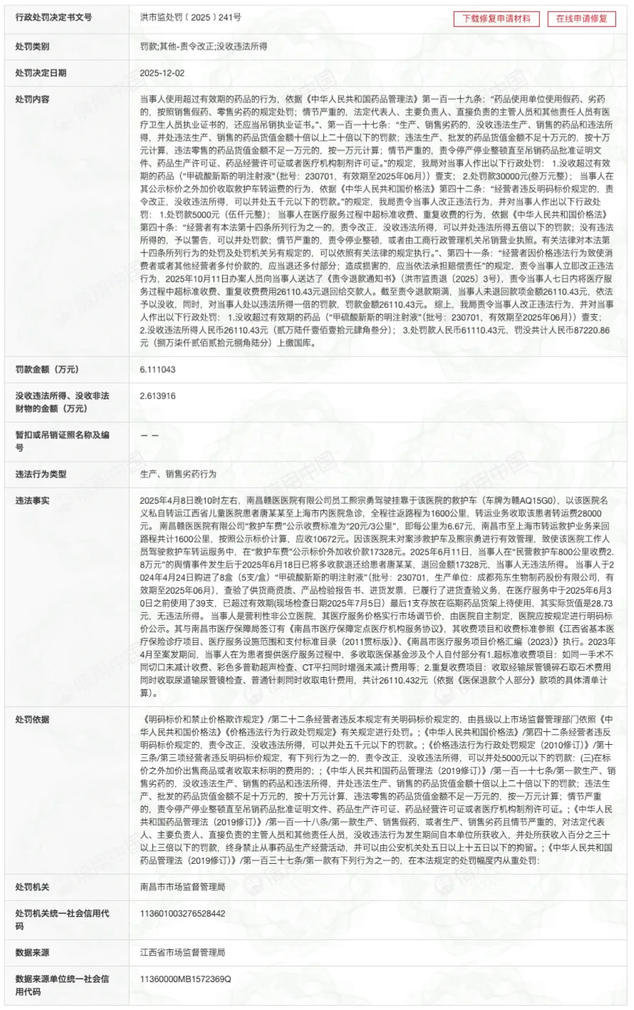 | 据信用中国网站系统显示,12月2日,此前“天价救护车”事件相关的南昌赣医医院因超标准加价收取转运费、重复收费、使用过期药品等违法行为,被南昌市市场监督管理局罚款6.1万余元,没收2.6万余元。