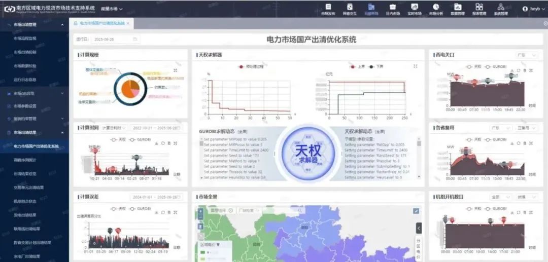 “天权”求解器软件界面图 微信公众号“南网50Hz” 综合中国新闻网、《中国电力报》等报道,南方区域电力市场是中国首个连续运行的区域电力市场,交易范围覆盖广东、广西、云南、贵州、海南五省区。 这也是全球规模最大的“电力超市”。转为连续结算后,该市场日均交易规模约38亿千瓦时,超过英国、法国、德国三国用电量规模的总和。 但庞大的交易规模背后,是极为复杂的计算难题:南方五省区纳入调度的2400多台火电、水电、核电、抽蓄、新能源、储能等发电机组,涉及超120万个出清变量、超200万条约束条件……如何在保障电网安全稳定运行的前提下,每隔15分钟就精准计算出购电成本最低情况下的发电机功率、开停时间、成交电价等关键参数? “这相当于一个大超市要在一个瞬间,同时精确计算6000个不同地点、120万种商品的价格、库存和配送路线组合,以实现效益最优。”南方电网电力调度控制中心(简称“南网总调”)总经理黄河这样向《中国电力报》类比道。 而按照清华大学教授、能源经济资深专家夏清的话来说,这么多市场要素一起出清,简直是一个世界性的难题。 因为这需要从“2的780000次方”种方案中,筛选出唯一一个最优解。求解器正是破解这道难题的关键。 据中国南方电网的微信公众号“南网50Hz”介绍,此前,南网总调采用的是美国的求解器Gurobi,单次计算平均耗时2111秒。 而在启用南方电网自主研发的电力求解器“天权”后,平均计算时间缩短至1827秒,计算性能平均超越Gurobi 14%,最大领先幅度达38%,同时运算误差降低23%,运算稳定性提升21%。